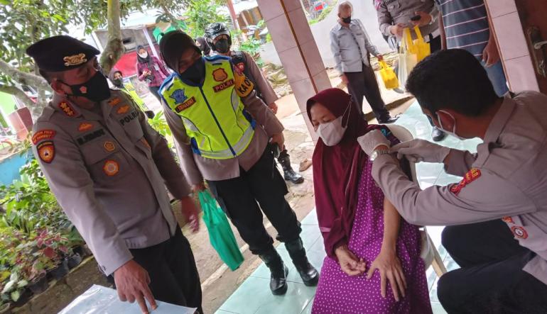 "Polisi punya program vaksinasi door to door, polisi hadir di sini yang dipimpin langsung ibu Kapolres dan pak RT, serta pak RW setempat untuk melakukan vaksinasi kepada warga yang belum divaksinasi Covid-19," ucapnya.