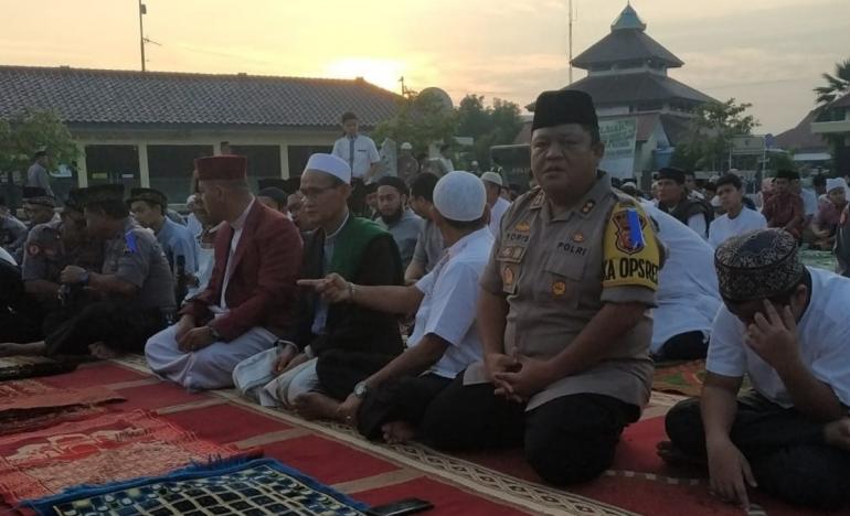 LampuHijau.co.id - Kepala Polres Indramayu AKBP M. Yoris MY Marzuki bersama sang istri yang juga Ketua Bhayangkari Cabang Indramayu Ny. Poppy Yoris melaksanakan Salat Idul Fitri 1440 Hijriah di halaman Mapolres Indramayu, Rabu (5/6/2019).