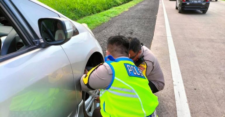 Usai ganti ban, Rudi bersama keluarga melanjutkan perjalanan, serta Kabag Ops Polres Subang Kompol Iwan Setiawan dan Bripka Boby Topana melanjutkan bertugas mengatur lalu lintas. (MGN)