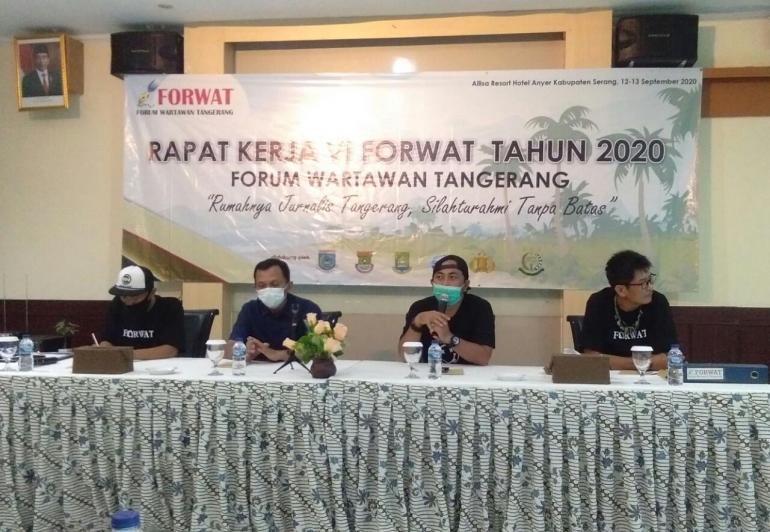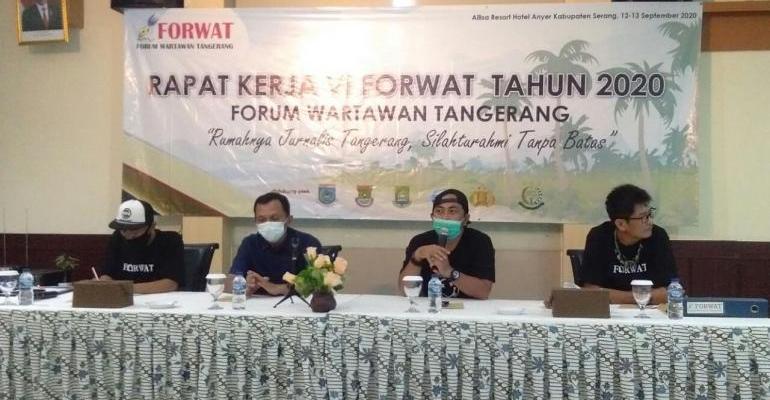 LampuHijau.co.id - Forum Wartawan Tangerang (Forwat) menggelar rapat kerja (Raker) di Allisa Resort Hotel, kawasan wisata pantai Anyer, Kabupaten Serang, Sabtu (12/9/2020). Agenda Raker Forwat ke-6 salah satunya membahas evaluasi program-program kerja forwat dan kaderisasi calon anggota. Sekitar 33 peserta yang tercatat hadir sebagai peserta Raker, dengan mengusung tema "Rumahnya Jurnalis Tangerang, Silaturahmi Tanpa Batas". Rangkaian kegiatan Raker tahunan ini terpantau mengikuti standar protokol Covid-19.