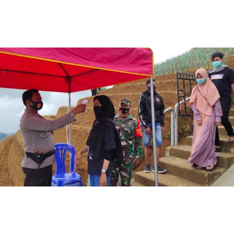 LampuHijau.co.id - Polsek Argapura, Majalengka bersama unsur Musyawarah Pimpinan Kecamatan (Muspika) Argapura sosialisasi Protokol Kesehatan (Prokes). Kegiatan mensosialisasikan tentang memakai masker, mencuci tangan, menjaga jarak (3M), ini menyambangi pengunjung yang ada di objek wisata Panyaweuyan Desa Sukasari Kidul.